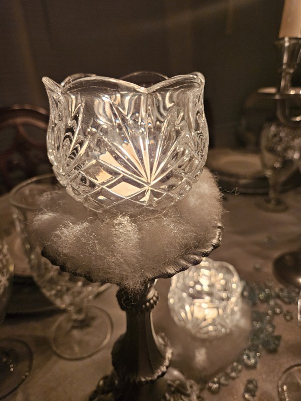 Remember I mentioned something I altered after I started taking photos of my Winter tablescape? If you compare the above photo to the very first photo in this post, you’ll see it – I really felt that the two silvery candlesticks at either end of the centerpiece were missing something. I decided they needed something soft and snowy for texture. I added bits of polyfill for the little tealight bowls to sit on, both on the candlesticks and on the table itself. It really helped soften all those hard surfaces!