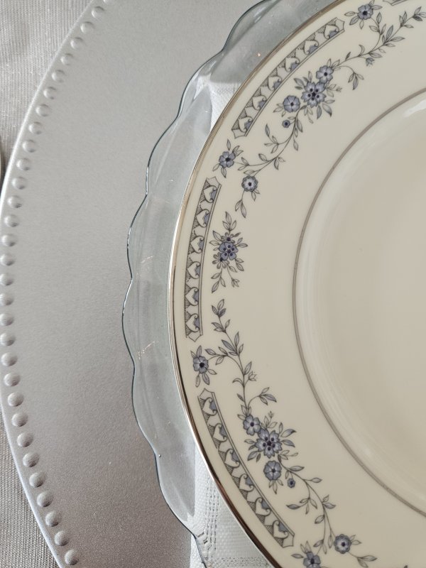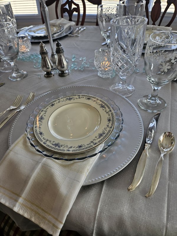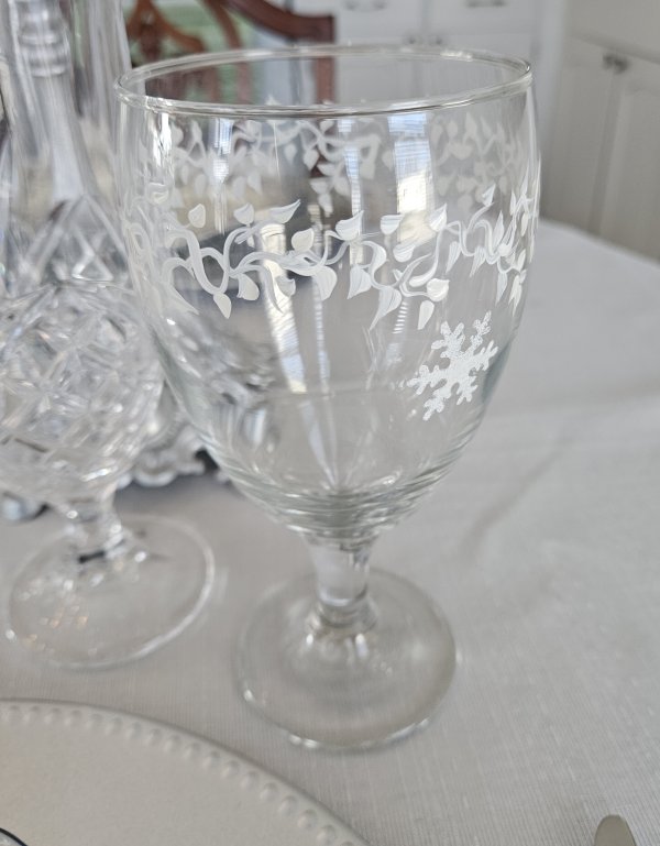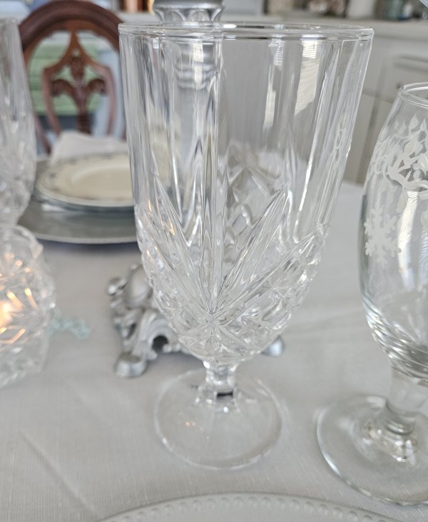 Glassware consists of the sparkly “Dublin” water glass on the left by Godinger (a recent Amazon purchase. You can find them here – this is my affiliate link, which means if you purchase from my link you pay nothing extra but I earn a small commission to help defray blog hosting fees. Thank you for supporting my blog!). It’s paired with a set of four wine glasses recently thrifted with a leaf and snowflake pattern. They are not marked, but are similar to some Libbey patterns I’ve seen.