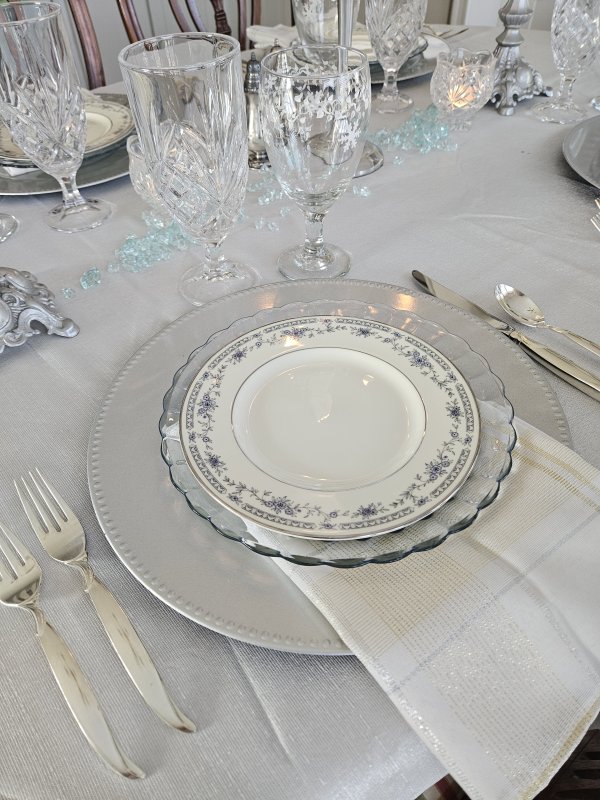 Wow! What a great looking tablescape. I love, love, love the icy theme. So pretty. Very nicely done, especially on a budget! Excellent.