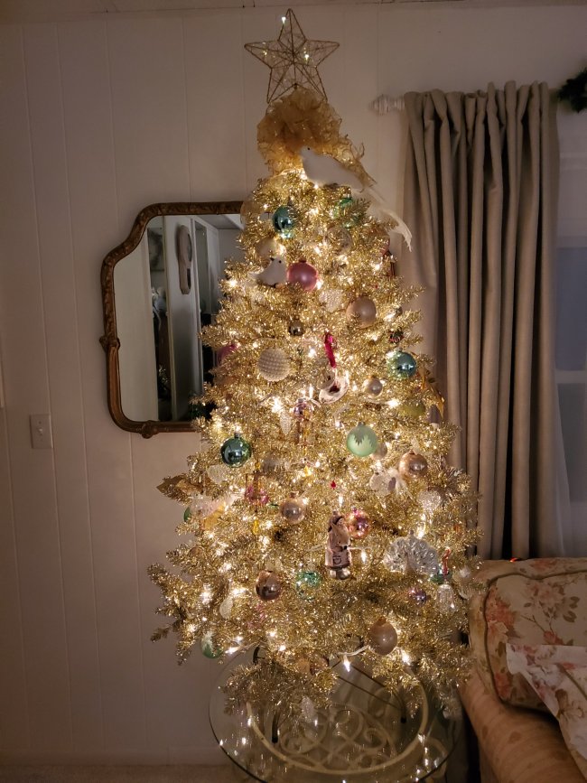 The biggest sparkle I brought to my decor this year was a new-to-me tree. Normally I would be using my pink flocked tree with its sweet Shabby chic vibe. But this year I knew I was going to need something less subdued, more gold, more glittery, and just… EXTRA! I got very lucky right around Thanksgiving because I found the perfect tree at my favorite consignment store at a great price. Brought him home and – voila! – instantly brighter spirits!
