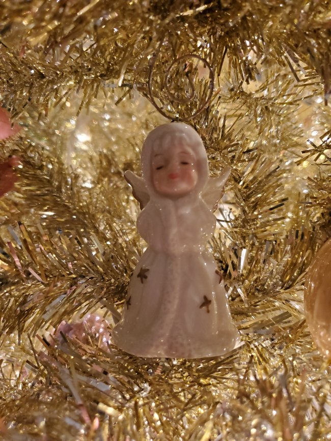 All of my existing ornaments look amazing on this tree – I only added a couple things this year: sparkly gold clip-on poinsettias from Dollar Tree and a set of gold “box”-style ornaments (with gold dangly jewels!) from the same consignment store. Here are some close-ups that hopefully capture the especially bright spirit of my 2020 Christmas tree: