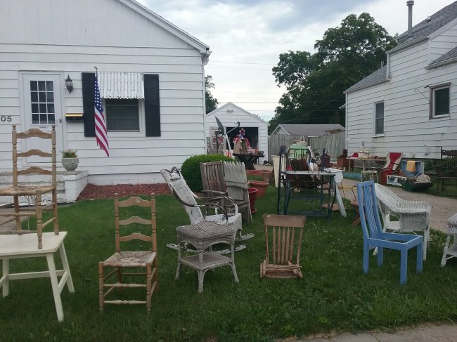 At the end I pulled a few unsold pieces back into my garage for future projects, and put the rest on the curb. This is what we listed as “free on curb” on Craigslist, minus the wicker rocker, which I dragged back to my own “pile” behind the garage. (I’m always astounded at how much gets picked from the curb by others before it goes onto the garbage truck.)