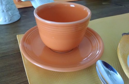 The coffee cups are Fiesta Ware – here’s a shot that almost depicts the yellow cup and saucer as yellow!